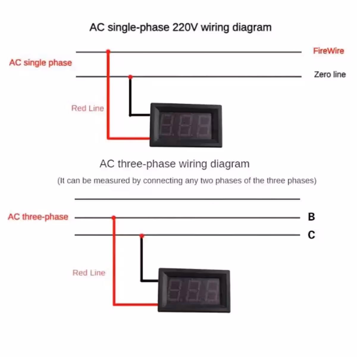 Digitales Voltmeter für Wechselstrom (AC) – Kompatibel einphasig und dreiphasig, Blaues LED-Display