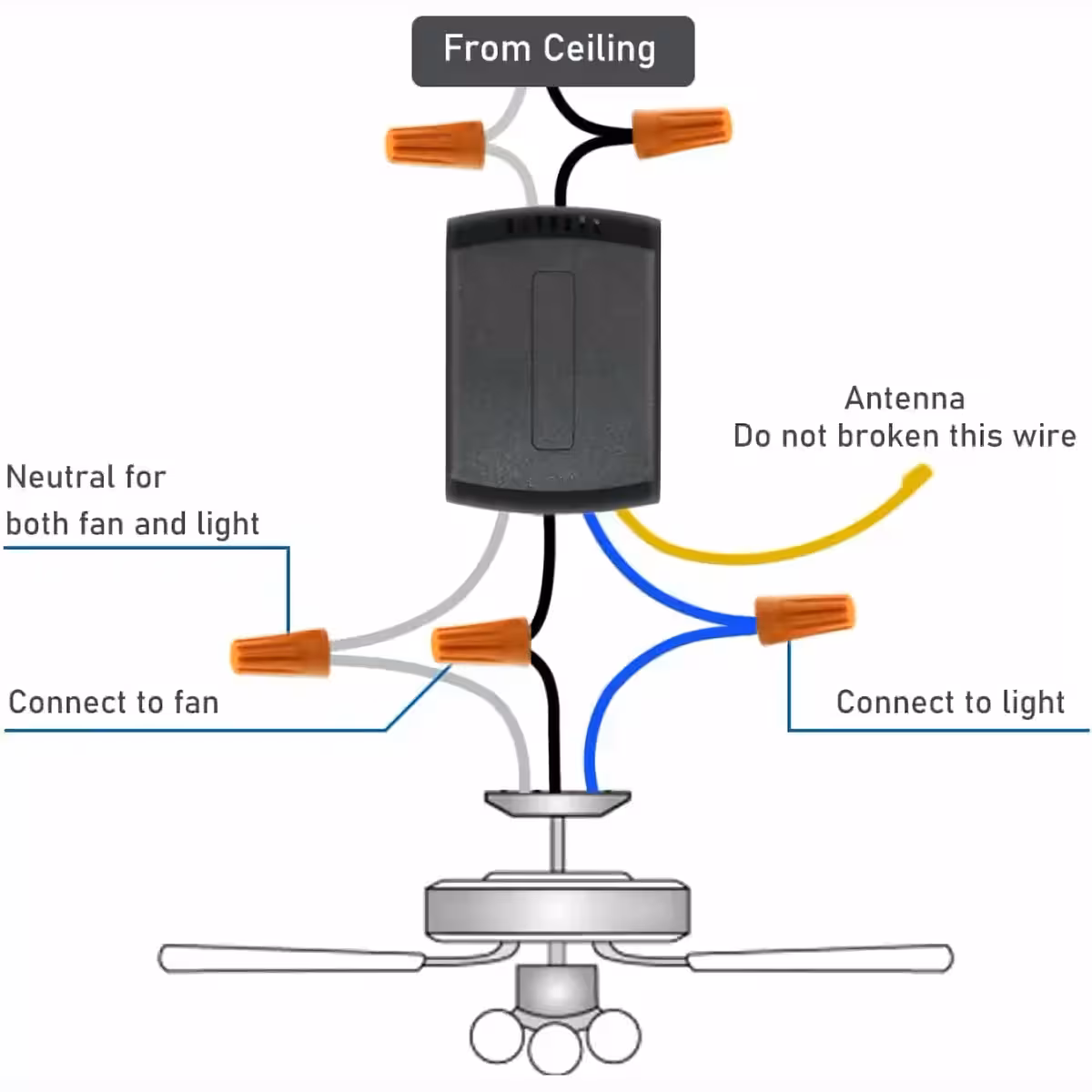 - Steuerung von zwei Kreisen: 1 für Ventilator + 1 für Licht