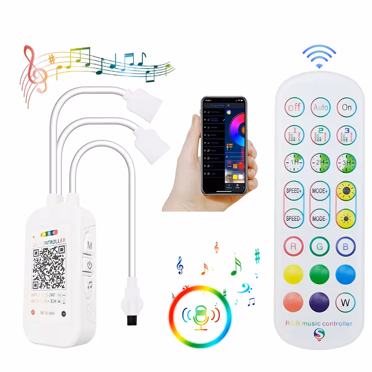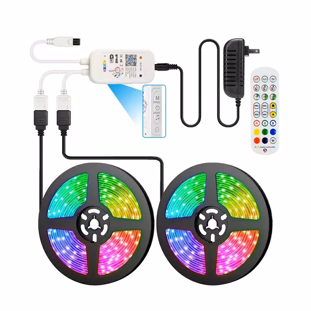 Die im Lieferumfang enthaltene Fernbedienung mit 24 Tasten bietet zusätzlichen Komfort, während die Dimmer-Funktion die Lichtintensität nach Belieben regelt. Der Musikmodus synchronisiert die Beleuchtung mit dem Rhythmus der Musik und sorgt für einen dynamischen Effekt, ideal für Partys.