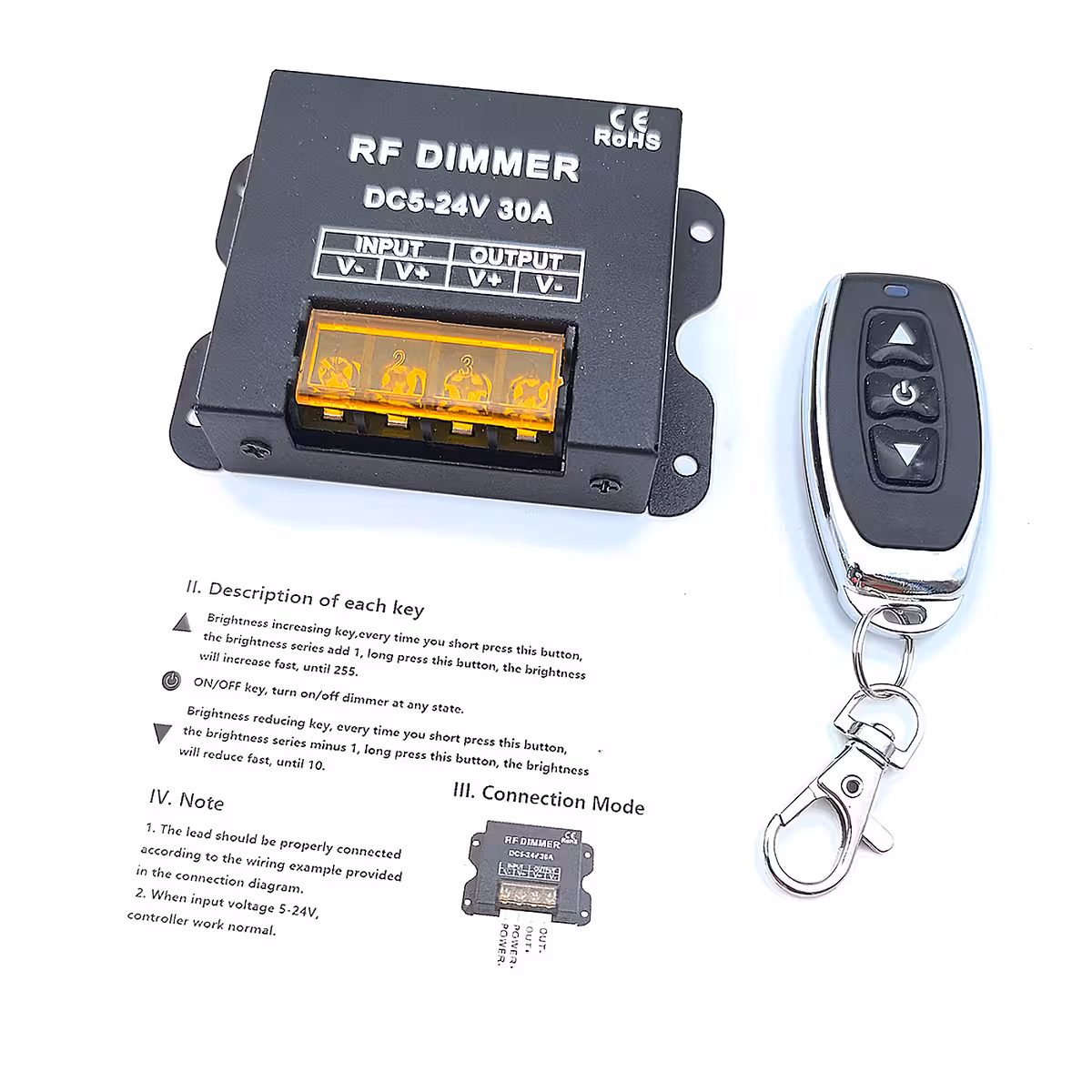 Dieser LED-Band-Dimmer, kompatibel mit Spannungen von 12V und 24V, ist ein DC 5-24V 30A Controller mit einer RF-Wireless-Fernbedienung mit 3 Tasten.