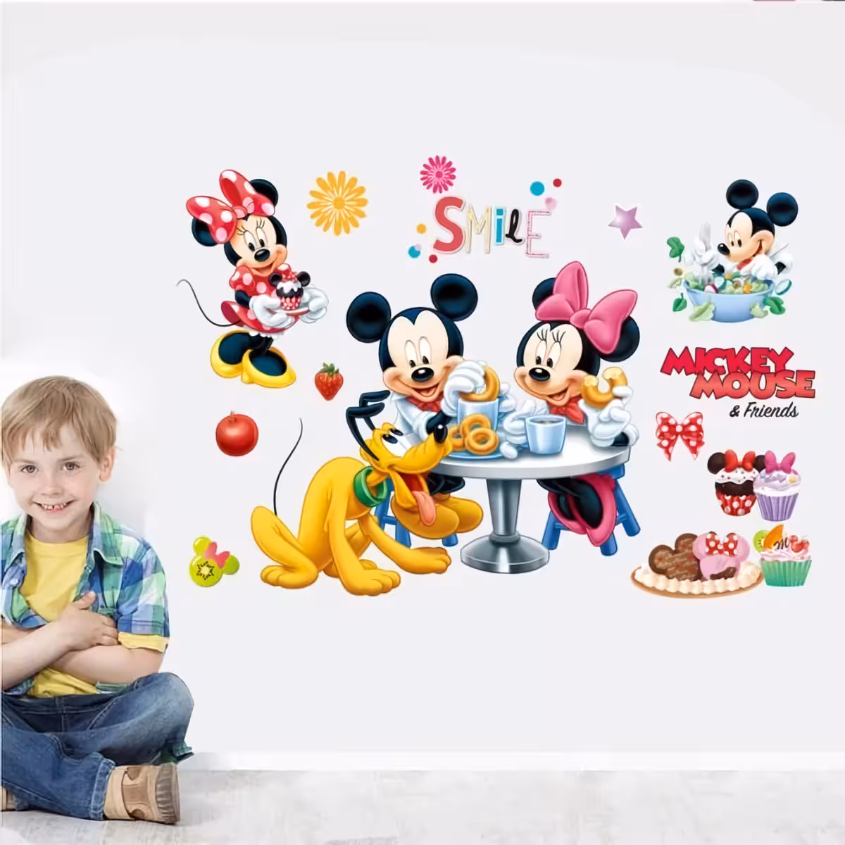 Selbstklebender dekorativer Wand- oder Möbelsticker, ideal für Kinderzimmer, Babys, Kindergärten oder Spielbereiche. Mit den beliebten Figuren Mickey Mouse, Minnie Mouse und Pluto verwandelt dieses bunte Set jeden Raum in eine fröhliche und kreative Ecke.