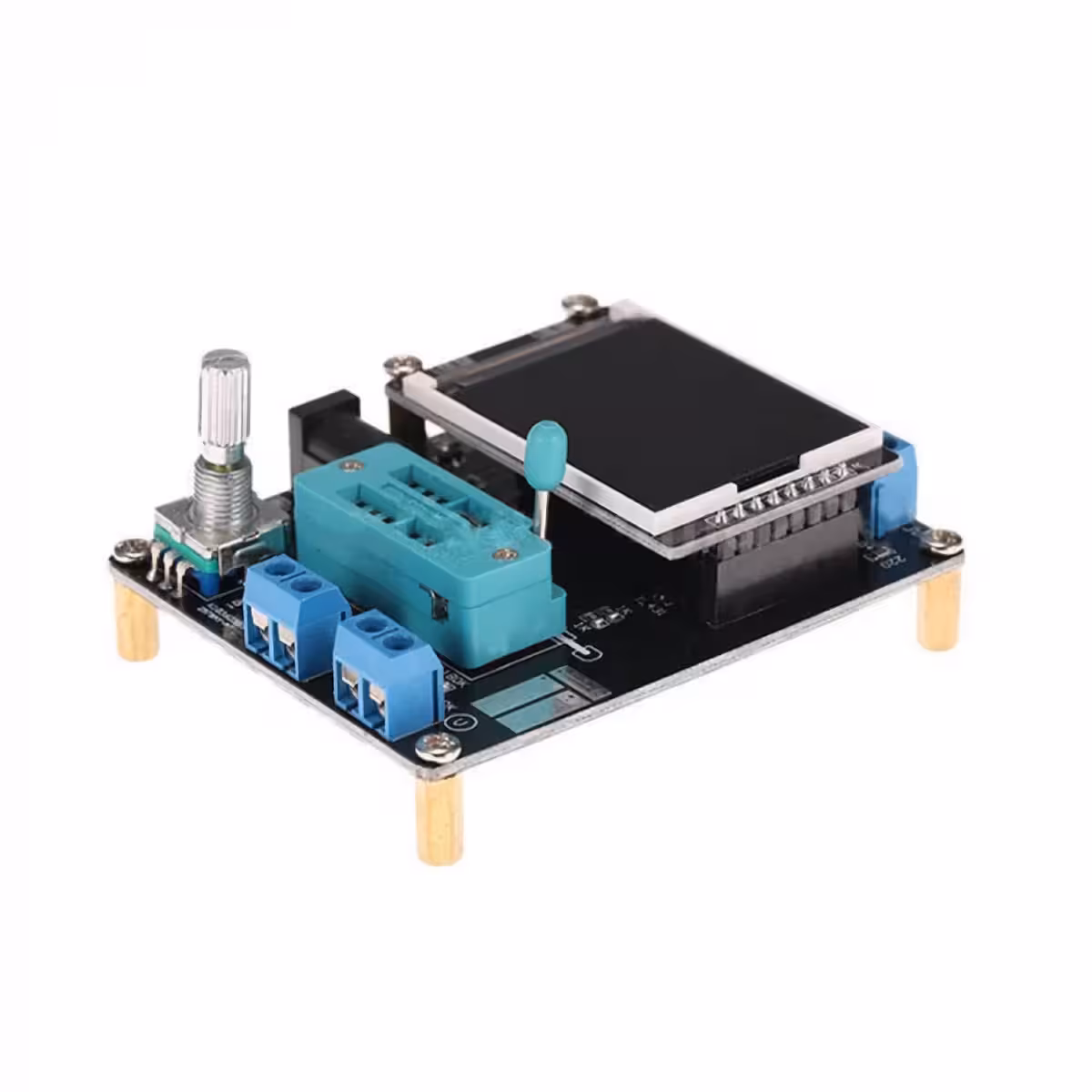 Enthält Frequenzgenerator, Voltmeter und IR-Codierer, alles integriert in einem ATMEGA328P DIP-28 Chip. Ausgestattet mit einem 160×128 Pixel Farbdisplay und grafischer Darstellung der getesteten Bauteilsymbole.