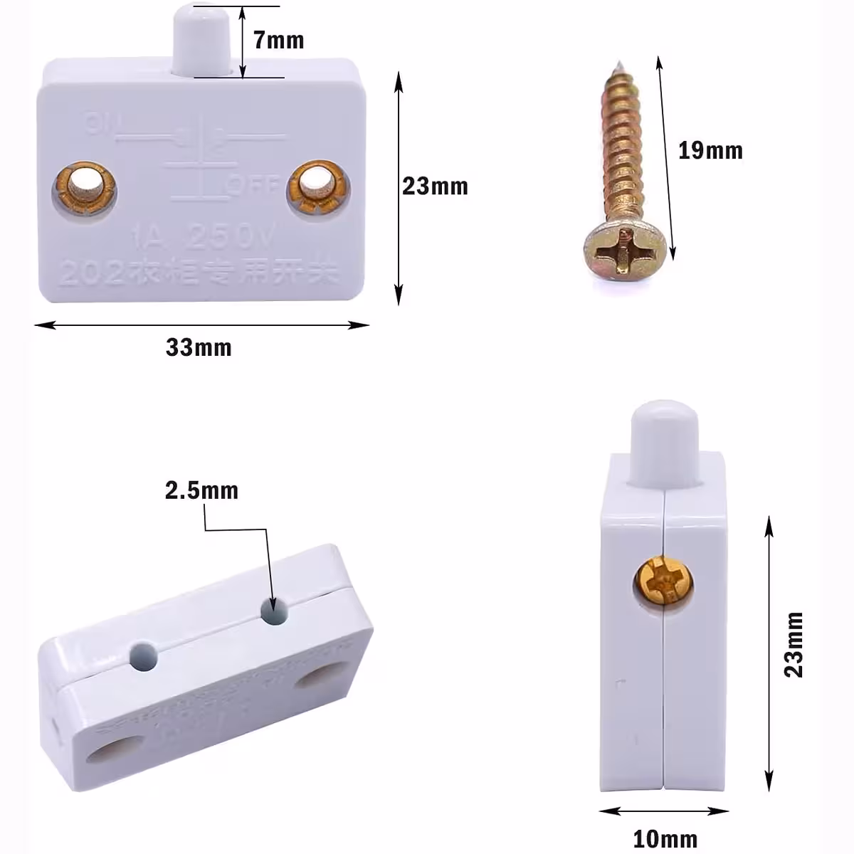 Dieser einbaubarer Schalter für Schranktüren mit Push-Sensor schaltet das Licht nur ein, wenn es benötigt wird. Keine unnötige Stromverbrauch, keine sichtbaren Schalter, keine komplizierten Eingriffe in das Möbelstück. Ideal für Bereiche, in denen die Beleuchtung nur beim Zugriff auf den Schrank benötigt wird.