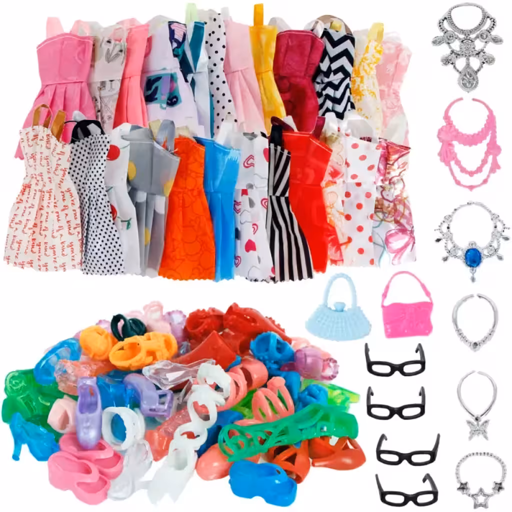 Komplettes Set aus Kleidung, Schuhen und Accessoires für Barbie-Puppen, ideal für modebegeisterte Mädchen und kreatives Spielen.