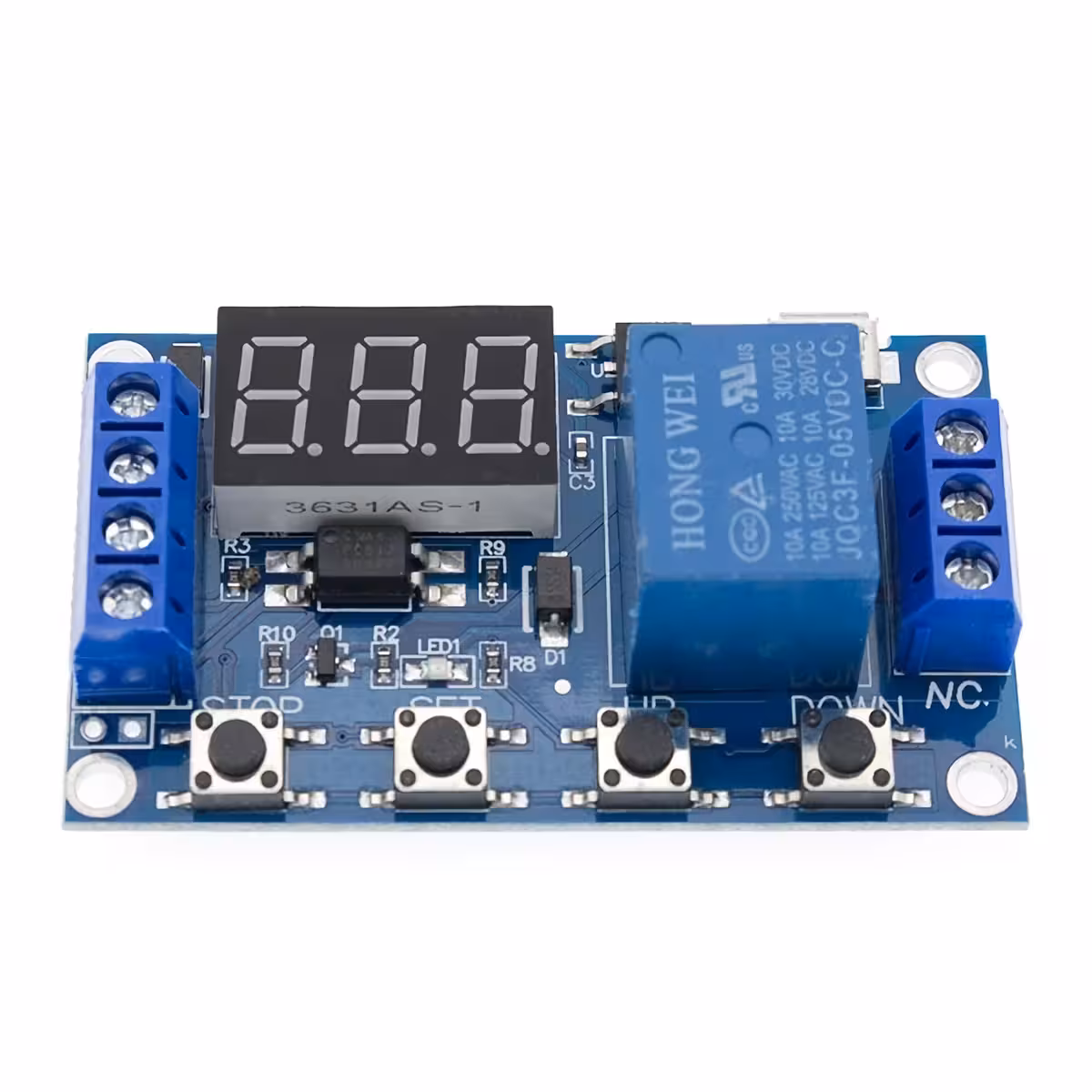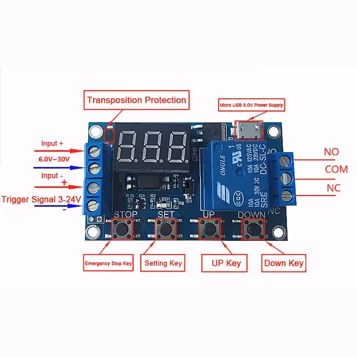 Das zeitgesteuerte Relais-Modul mit einstellbarer Verzögerung und kompatibel mit 6–30V (MicroUSB 5V Stromversorgung möglich). Ideal für industrielle Anwendungen und DIY-Projekte, die ein Relaismodul mit Verzögerung, Steuerung und einstellbarer Zeit, mit digitalem Display und Anti-Interferenz benötigen.